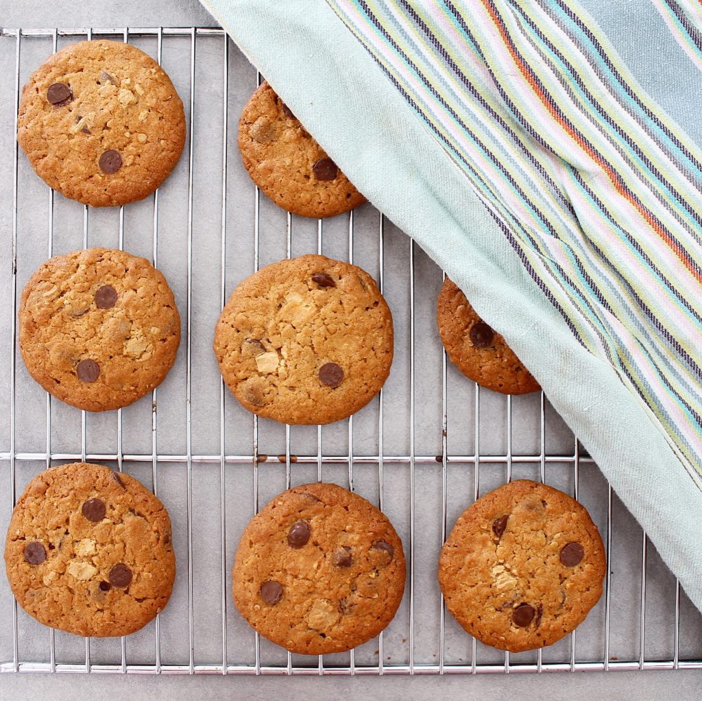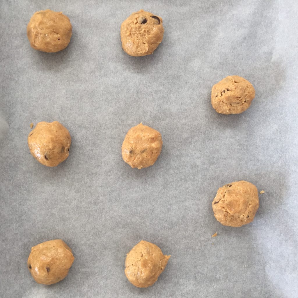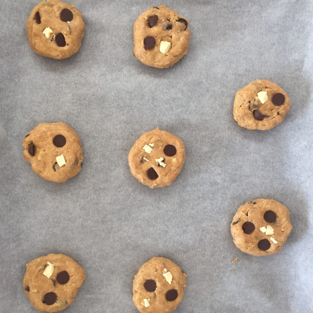 Start med at blande mel, bagepulver og havregryn. Kom herefter smør, vaniljesukker, sukker, brun farin og peanutbutter i en anden skål. Pisk det til en cremet masse (ca. 2-3 min.) og tilsæt så ægget. Pisk herefter i ca. 2 min. mere. Vend så melblandingen i og sørg for at massen er ensartet. Til sidst vendes chokoladen i – jeg brugte kun 2/3 af chokoladen og resten lagde jeg oven på cookies’ne inden de skulle i ovnen.